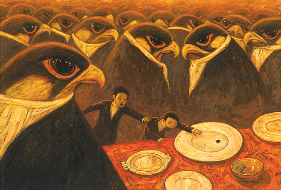 Kalabalık toplantılarda, partilerde hissedilen kişisel kaygı ve sosyal hayatta hata yapma endişesi bu resimde çok güzel betimlenmiş. Durgun görünen, hepsi resmi giyimli şahinler her an saldıracak gibi bakıyor. Hangimiz bu kaygıyı yaşamadık ki. Sakın bir davette son zeytini yeme.